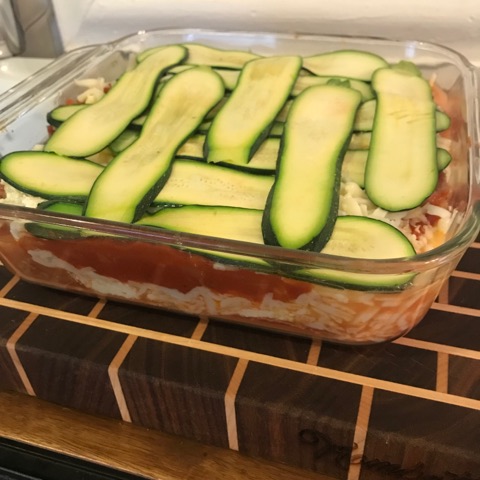 6. In a 9x12 Baking Dish, layer the Lasagna in this manner: Meat mixture, Ricotta mixture, Zucchini slices, Mozzarella. End with Zucchini.